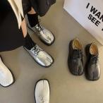 おしゃれ 足袋 シューズ レディース フラット ぺたんこ ローファー 黒 無地 PU レザー レースアップ 光沢 ペタンコ靴 ローヒール トレンド カジュアル