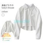 長袖シャツ レディース ショート シャツ 白 ワイシャツ 長袖ブラウス ゆったり シンプル ホワイト ブラウス コットン 短め トップス