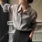 ゆったり シースルー ショートフロントロングバック 透け感 シャツ 長袖 折り襟 襟付き 羽織り シアー素材 ラウンドカット アイスシルク トップス レディース