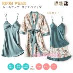 ルームウェア 4点セット ガウン付 サテンパジャマ オールシーズン シルクタッチ サテン キャミソール ショットパンツ 薄手 パッド付き 部屋着 快適