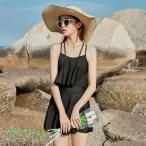 水着 レディース ワンピース水着 大きいサイズ キャミソール フリル水着 体型カバー ショートパンツ シャーリング リボン ブラック 無地 シンプル 海 プール 両