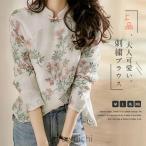 ブラウス シャツ 長袖 チャイナ シャツ トップス 花柄 チャイナシャツ レディース 立ち襟 ハイネック 花柄 おしゃれ かわいい チャイナボタン 綿麻調 刺繍 春
