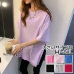 トップス レディース 袖あり Tシャツ 半袖 カジュアル おしゃれ 可愛い クルーネック カットソー サイドスリット 細見え 薄手 ピンク ブルー ブラック ホワイト