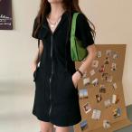 レディース ワンピース ショート 半袖 チュニック パーカー ジップアップ フード付き 無地 私服 カジュアル 女子 運動着 ポケット 女の子 普段着 春夏