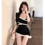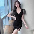 スリット ブラック ミニワンピース 半袖 秋冬 韓国風 タイトワンピース ショート丈 Vネック ワンピース コーデ 20代 30代 キャバドレス