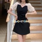 レディース ワンピース 半袖 ショート丈 Vネック パフスリーブ ハイウエスト Aライン 無地 フェミニン パーティードレス 大きいサイズ S-4XL