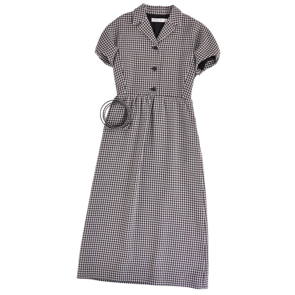 【極美品】クリスチャンディオール Christian Dior ワンピース 2023 ベルト付き ショートスリーブ 半袖 千鳥格子 ウール レディース イタリア製 36(S相当) グレー【中古】