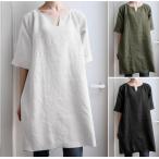 チュニック シャツ ワンピース レディース トップス 半袖 綿麻 リネン コットン ブラウス スキッパー Vネック 無地 ゆったり 体型カバー 春 夏