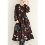 ワンピース ヴィンテージ風花柄プリントのコットンコーデュロイミディアムワンピース