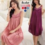 ネグリジェ レディース キャミソールワンピース ひざ下丈 ミディアム丈 サテン調 ノースリーブ 無地 フリル レース リボン 薄手 透け感 単色 無地