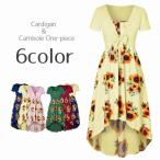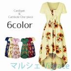 キャミソールワンピース カーディガン 2点セット レディース Aライン ミディアム 膝丈 半袖 フィッシュテール フレア 花柄 ひまわり 前結び おし