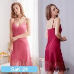 スリップ キャミソール レディース Vネック ワンピース ランジェリー ひざ丈 ミディアム丈 サテン調 レース 無地 ルームウエア インナー
