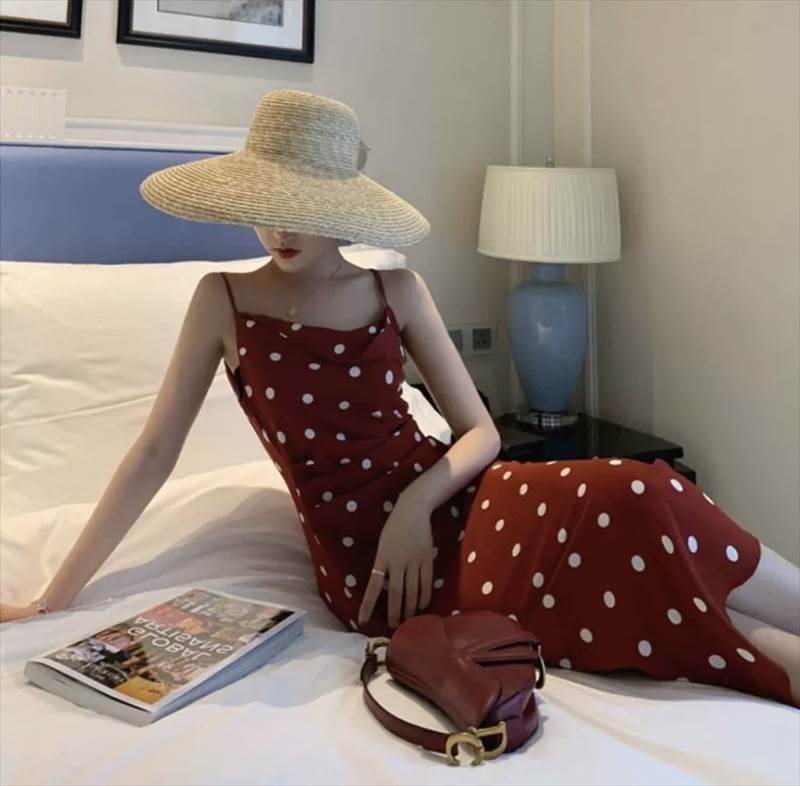 ワンピース ミディアム丈ワンピース キャミソールワンピース 袖なし ウエストマーク ロング丈 かわいい 大人可愛い きれいめ シンプル 上品 おしゃれ かっこいい レトロ こなれ感 個性的 主役級 存在感 抜け感 ドット柄 キュート ガーリー セクシー クール ナチュラル