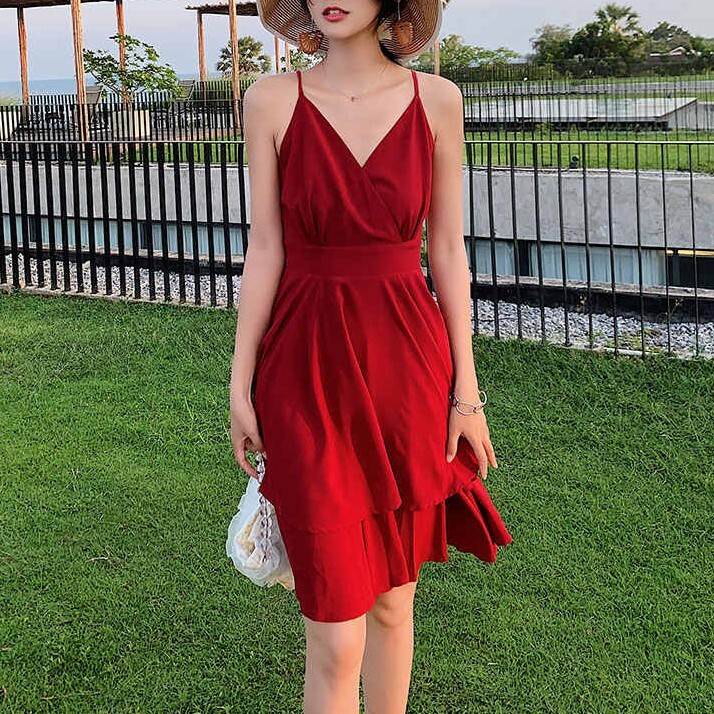 レディース ワンピース キャミソールワンピース サマードレス ミディアム 膝丈 膝上 袖なし ノースリーブ Vネック 襟なし 裾ティアード Aライン 背中開き フェミニン バッククロス バックリボン バックコンシャス ハイウエスト バックファスナー 大人可愛い きれいめ