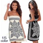 ワンピース ベアトップワンピース チューブトップ レディース 女性用 ミディアム丈 膝丈 フレア スカート ハイウエスト プリント パネル柄 おしゃれ きれい かわ