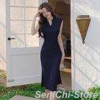 ワンピース タイト ワイドリブ 全3色 キーネック ノースリーブ リブニット サイドスリット ミディアム丈 膝丈 オフィスカジュアル 春 夏