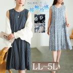 大きいサイズ レディース ワンピース 接触冷感 ミディアム ノースリーブ 花柄 タック フレア 夏コーデ 夏 秋 春 LL 2L 3L 4L 5L ネイビー サックス 体型カバー