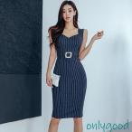 ストライプ柄 ワンピース パーティードレス ウエストマーク タイト ノースリーブ 紺 ミディアム丈 きれいめ 結婚式 謝恩会 発表会 春夏