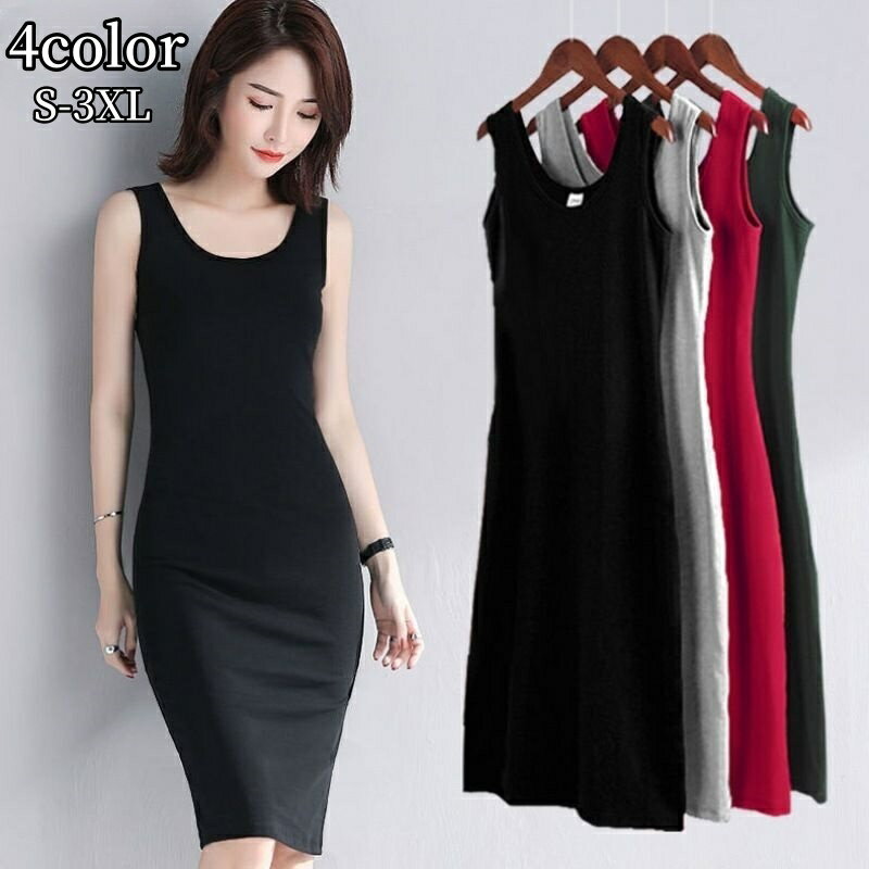 送料無料 ワンピース タンクトップ タイト スリム レディース ノースリーブ 膝丈 無地 シンプル 大きいサイズ Uネック 丸首 ラウンドネック ひざ丈 ミディアム丈 ミディ丈 袖なし プルオーバー カジュアル 着回し 合わせやすい 普段着 春 夏 秋 女性 婦人用 S M L XL 2XL 3XL