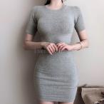ワンピース 半袖 膝上丈 タイト セクシー ラウンドネック レディース ミディアム丈 無地 ボディコンワンピース スレンダーライン 着痩せ 春夏20代30代40代