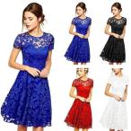 ワンピース ラウンドネック 半袖 ミディアム丈 ミディ丈 レディース Aライン フレアスカート レース シースルー 透け感