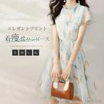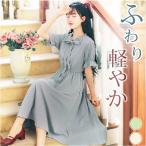 ワンピース 半袖 Aライン フレア シフォン 膝下丈 ミディアム丈 レディース 女性 婦人服 スクエアネック ハイウエスト パフスリーブ ギャザー 無