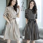 ワンピース 半袖 ミディアム 膝丈 バンドカラー クルーネック 丸首 レディース ストライプ 可愛い Aライン きれいめ おしゃれ 婦人服 女性
