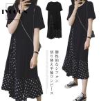 ワンピース レディース 半袖ワンピース ミディアムワンピース 膝上丈ワンピース シフォン切り替え ドット柄 カットソー フレア 英字プリント 切り替え