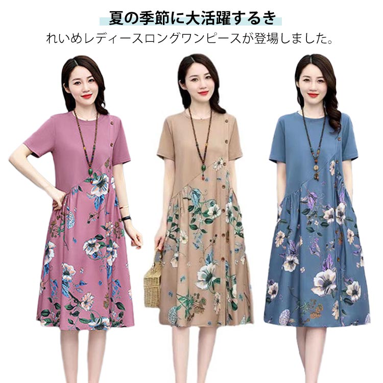 ワンピース レディース ロング丈 ワンピ 春夏 夏 半袖 ロングワンピース 花柄 リゾート 軽い 涼しい きれいめ カジュアル ミモレワンピース Vネック 20代 30代 40代 50代オシャレ 可愛い かわいい カワイイ きれいめ 膝下ワンピース ミディアム丈ワンピース