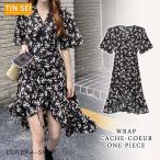 ワンピース レディース 秋 冬 秋冬 黒 ミディアムワンピース 半袖 きれいめ ひざ丈 花柄 ラップワンピース ブラック 大人 20代 30代 40代