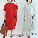 ワンピース レディース 大きめ 半袖 ミディ丈 ミディアム丈 スリット サイドスリット Vネック ゆったり ラフ シンプル 無地 ポケット 春夏 カジ