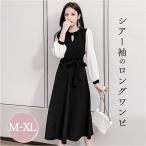 ワンピース レディース 楽天 おしゃれ オシャレ 長袖 ウエストマーク バイカラー きれいめ ロング ミディアム ラウンドネック Aライン ワンピ ウエストリボン 膝下 上品 透け感 かわいい 可愛い 春 秋 冬 シンプル フェミニン 体型カバー ゆったり
