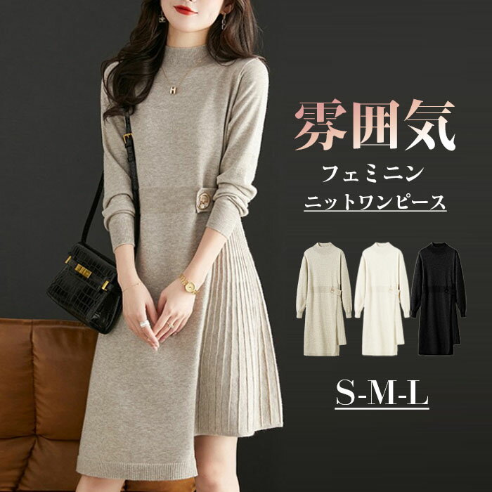 ニットワンピース ギャザー プリーツ Aライン ワンピース レディース リブ ニットワンピ 膝丈 ミディアム丈 きれいめ 上品 大人 ブラック 秋冬 ハイネック 長袖 きれいめ ハイウエスト 体型カバー 柔らか 暖かめ フェミニン雰囲気 大人可愛い