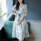 膝丈ワンピース 長袖 シフォンワンピ 花柄 レディース ワンピース Vネック 長袖ワンピース ミディアム丈 通勤 レトロ 花柄ワンピース シフォン