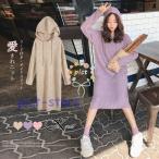 リブニットワンピース レディース 秋冬 ミモレ丈 パーカーワンピ ストレッチ ミディアム ワンピース 長袖