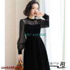 ワンピース レディース きれいめ ベロアワンピース 秋 冬 ミディアム丈ワンピース レース繋がり 長袖 フォーマルワンピース 二次会 通勤 OL 30代 40代 着痩せ
