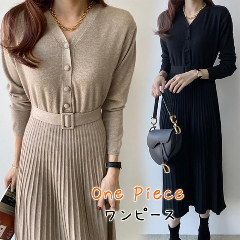 ワンピース レディース ニットワンピース プリーツ ボタン Vネック 長袖 ミディ丈 ミディアム ロング ベルト 秋 通勤 可愛い ゆったり シンプル