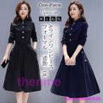【限定全品15%OFFクーポン配布】ワンピース リボンタイ ドッキング ブラウス風 長袖 ウエストマーク フェミニン ビンテージ クラシック 結婚式 二次会 ミディアム丈 体型カバー きれいめ フォーマル エレガント S/M/L/XL/2XL ネイビー