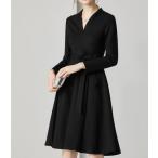 フォーマルワンピース 春夏 長袖 ミディアム丈 Aライン フレア 上品 ノーカラー ウエストリボン Vネック ひざ丈 お呼ばれ 食事会 フォーマル 上品 エレガント 無