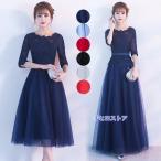 ミモレ丈ドレス パーティードレス 袖あり 発表会 成人式 結婚式 黒ドレス レディース ワンピース ミディアム 花嫁