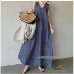 ワンピース ノースリーブ デニムワンピース ロングワンピース マキシ丈 Vネック Aラインワンピース 無地 大人 30代40代50代 ゆったり 広い裾