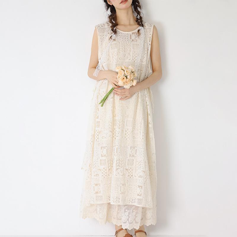 ワンピース レディース 日系 森ガール フェミニン 重ね着 凝った刺繍 透かし編み ジャンパースカート ゆったり ノースリーブ ロング丈 着回し 春夏