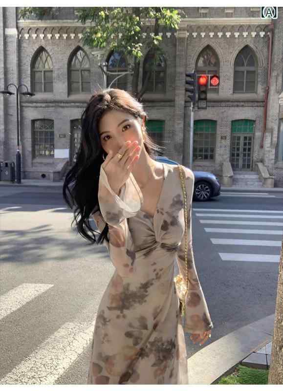 ワンピース レディース Aライン 秋用 長袖 体型カバー 新 中国式 レトロ プリント v ネック ワンピース 子供 秋 スリム スカート ラッパ 袖 A 字 ロング スカート
