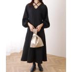 ワンピース クロスリボン Vネック バルーン袖 ロング ワンピース