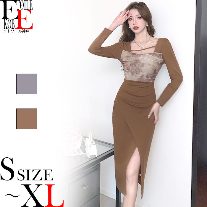 【80%OFFセール】ワンピース チャイナドレス ミモレ 膝下 チャイナ 中華 長袖 袖あり ワンピ きれいめ タイト タイトワンピース 胸元 スリット パーティー キャバ スナック ラウンジ ドレス 色気 お水 黒 ブラック 韓国 ファッション