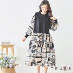 TRUBE ワンピース 長袖 30代 40代 通勤 日常着 普段着 旅行 アート柄 ティアード チュニック レディース 婦人服 春 M L 青 ミント ワンピース404 N83-249