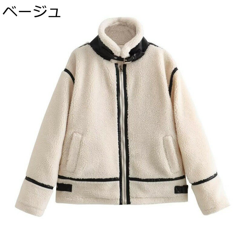 【20%OFFクーポン〜】防寒着 ボアパーカー ボアジャケット レディース フルジップ ショート 立ち襟 PUレザー パッチワーク 大きめ ボアコート バイカラー 可愛い シンプル 作業着 部屋着 フリースジャケット アウター ベージュ