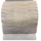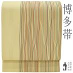 名古屋帯 未使用 本場筑前博多織 正絹 八寸 博多織 博多帯 縞遊び 薄黄ベージュ 白 流線 カジュアル 新古品 仕立て上がり みやがわ sb55077