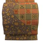 美品 名古屋帯 優品 八寸名古屋帯 鳥 草花 茶色 正絹 中古