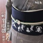 「撫松庵」細帯 半幅帯 猫獣戯画 刺繍 紺 (103-102-012-78) ネイビー 濃藍 鳥獣戯画 猫 蛙 うさぎ 狐 リバーシブル 着物 和装 大人 fj508
